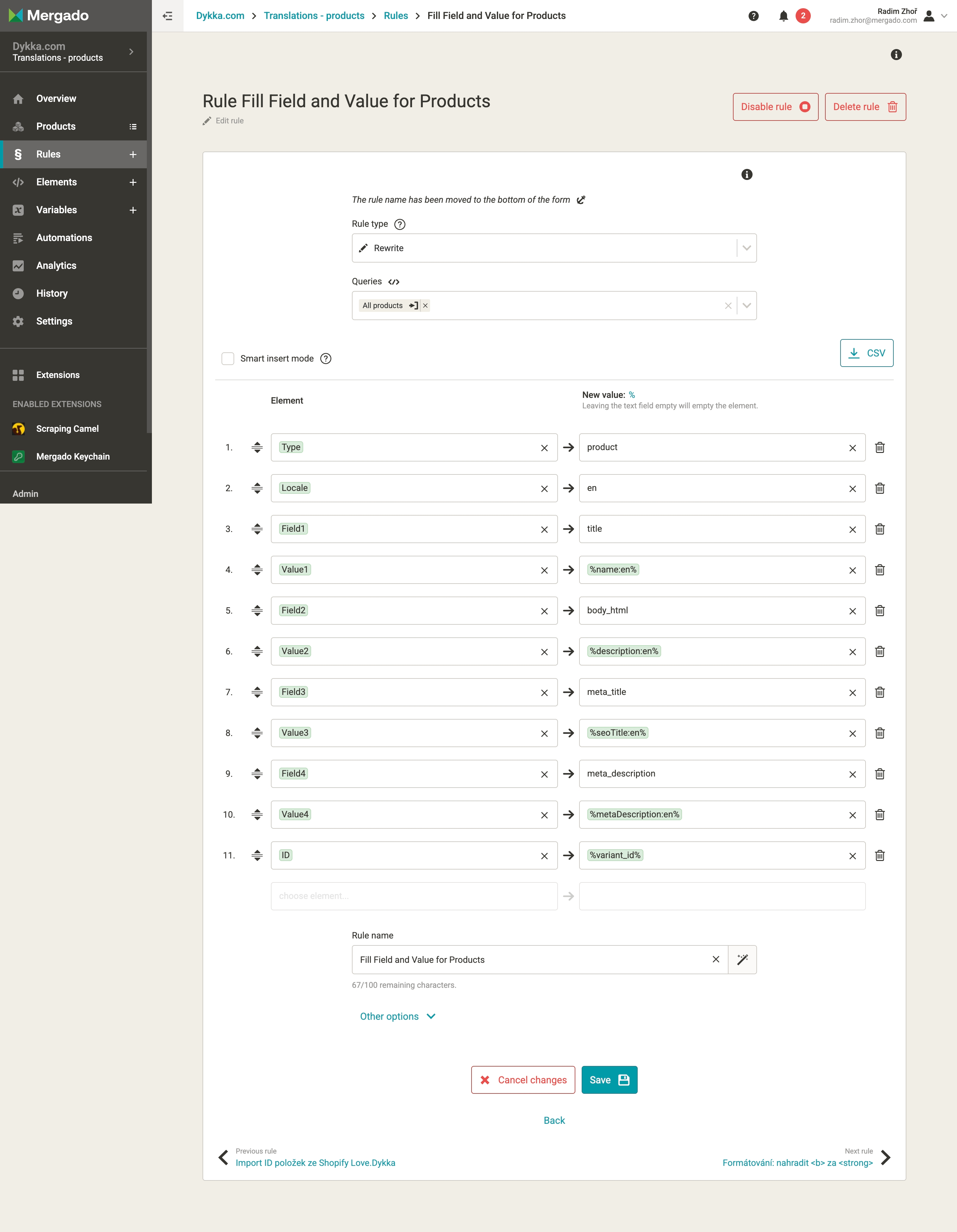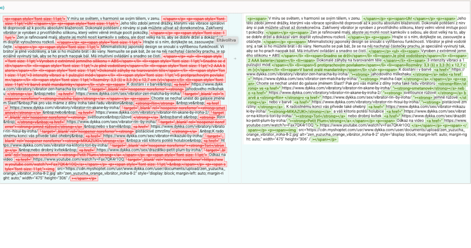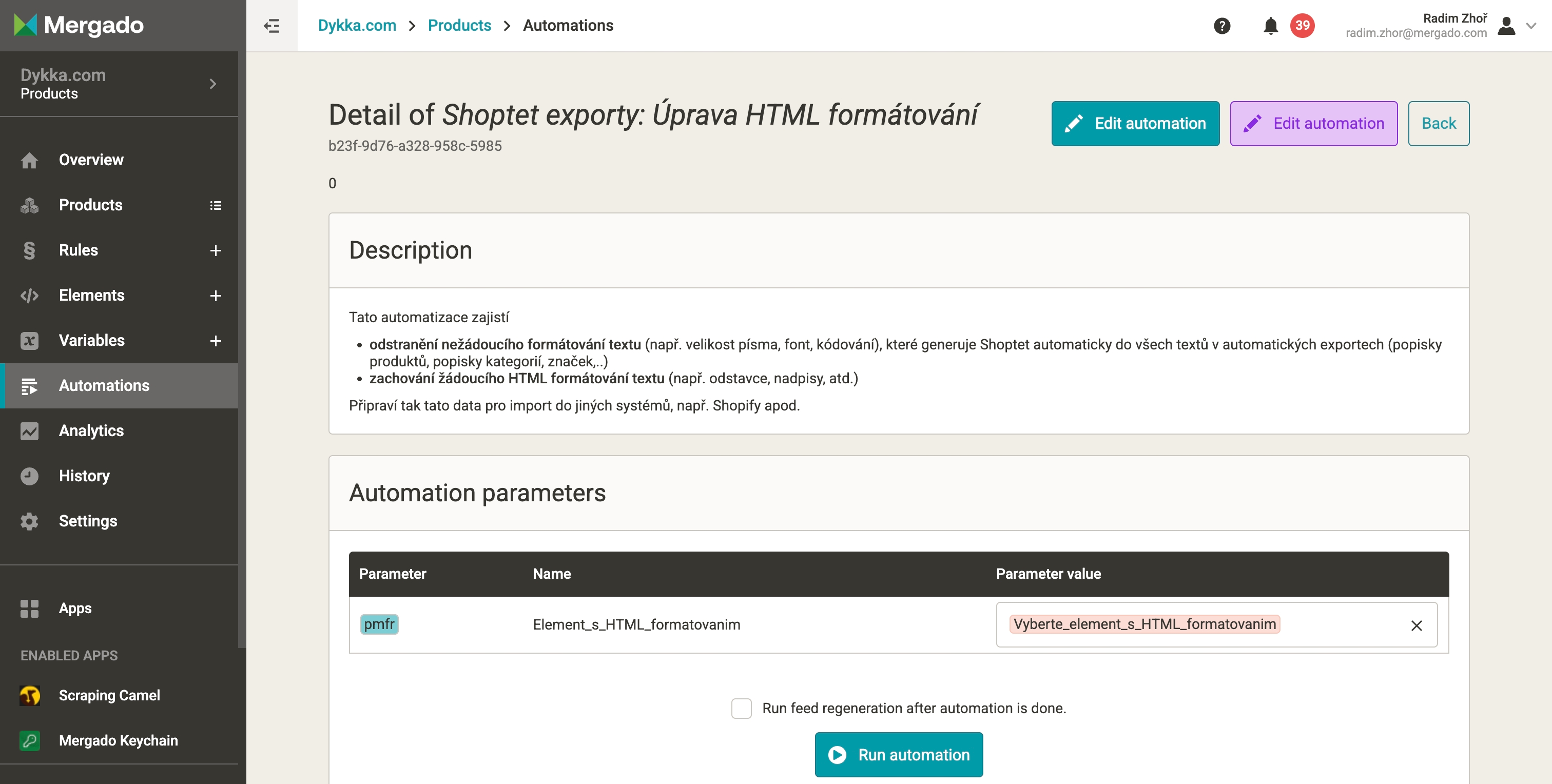 - Text formatting — for any element that contains formatted text (in our case, e.g., Value2 → %description:en%), run the Shoptet export: HTML formatting cleanup automation.