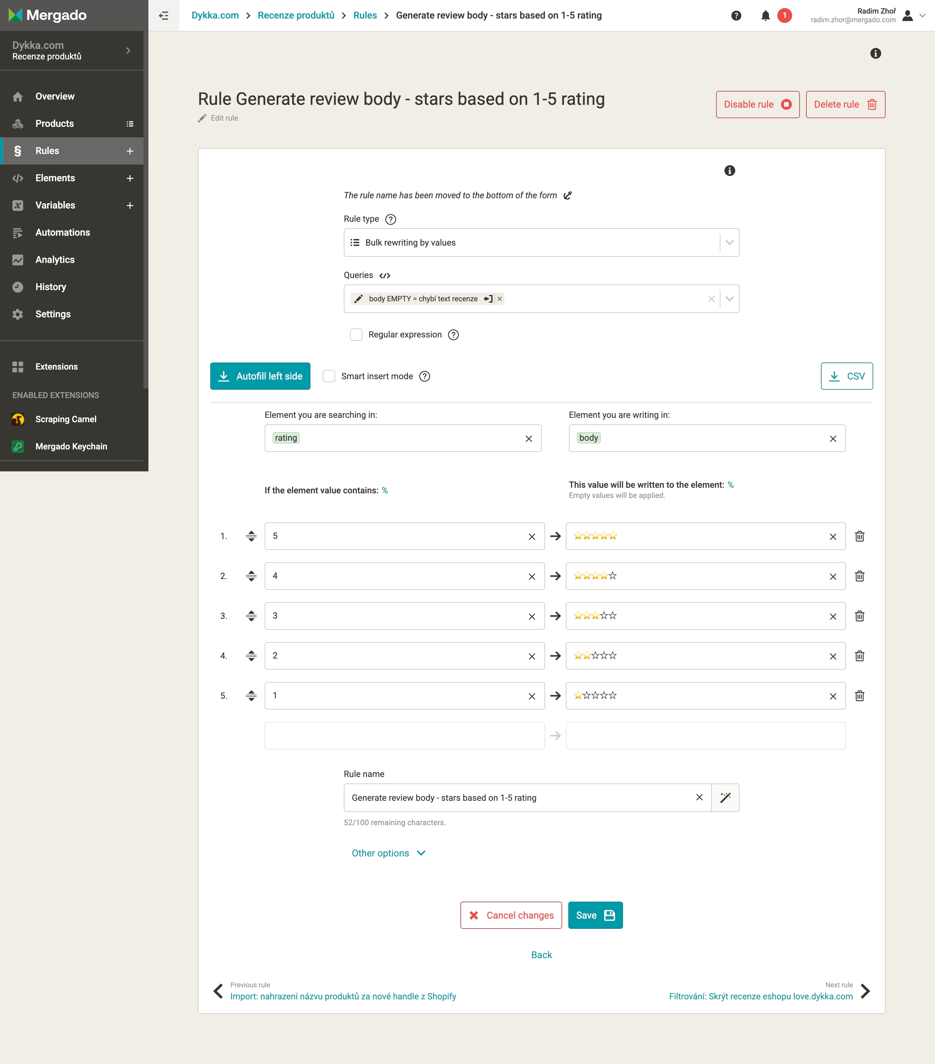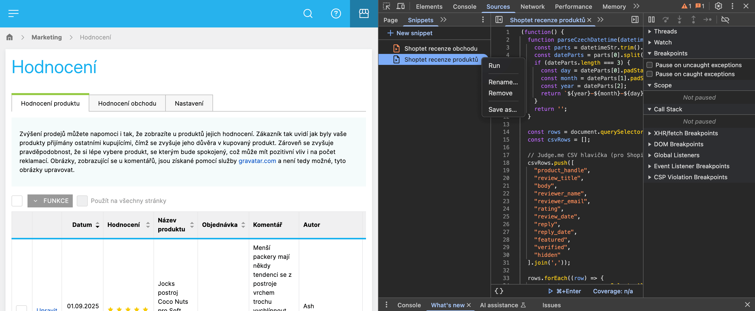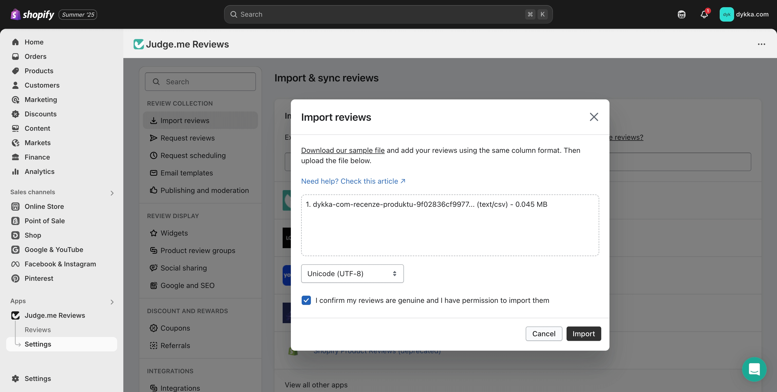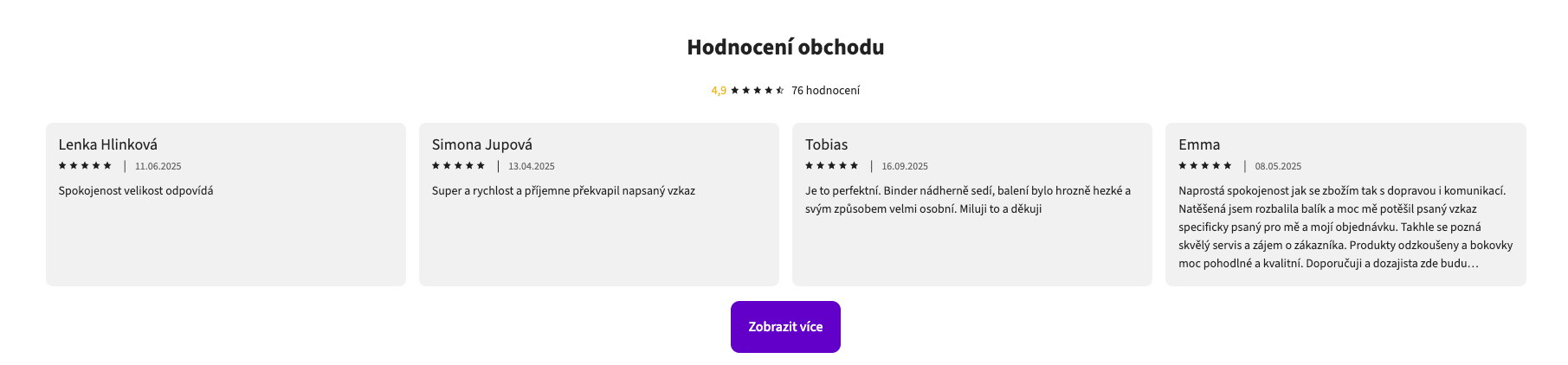 Shoptet does not allow exporting customer reviews in a standardized format, and Shopify cannot import them via API. To solve this, we exported reviews from Shoptet into CSV using our own script in the Judge.me format. Then, through the Judge.me Shopify app, we imported them into Shopify. The required adjustments (such as adding product handles) were done in Mergado Editor.