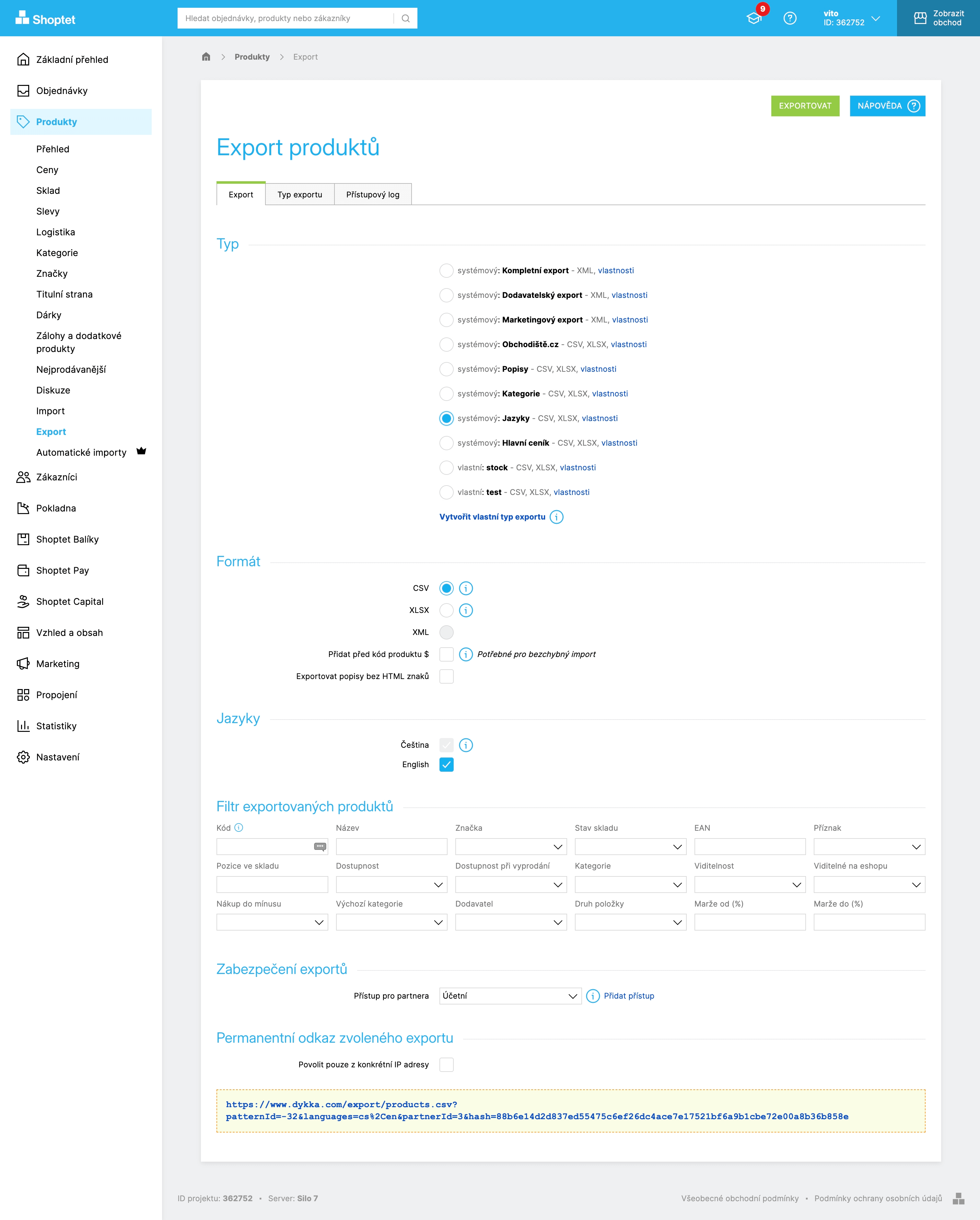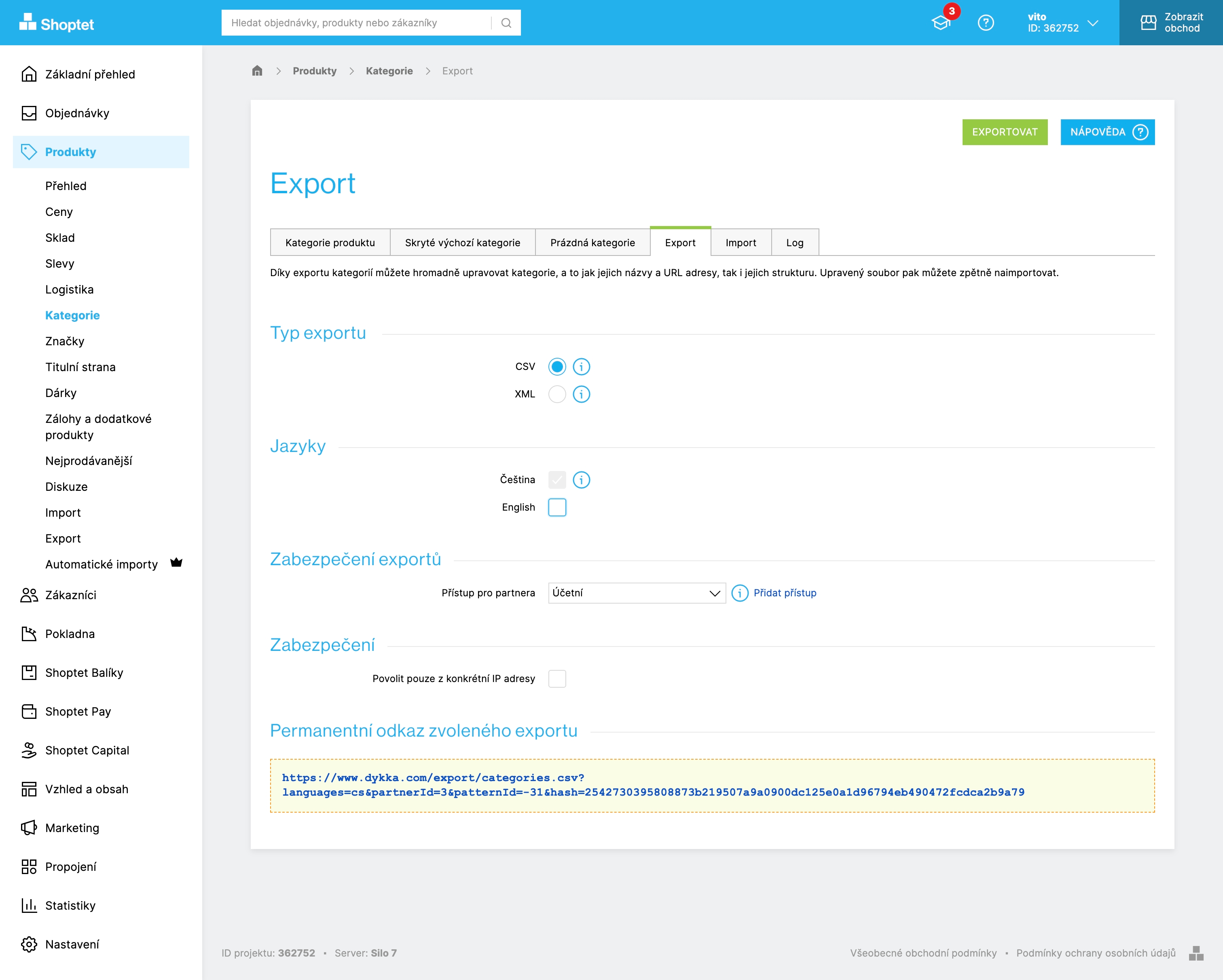 - In Shoptet admin, go to Products → Categories → Export (CSV) and select language CZ.