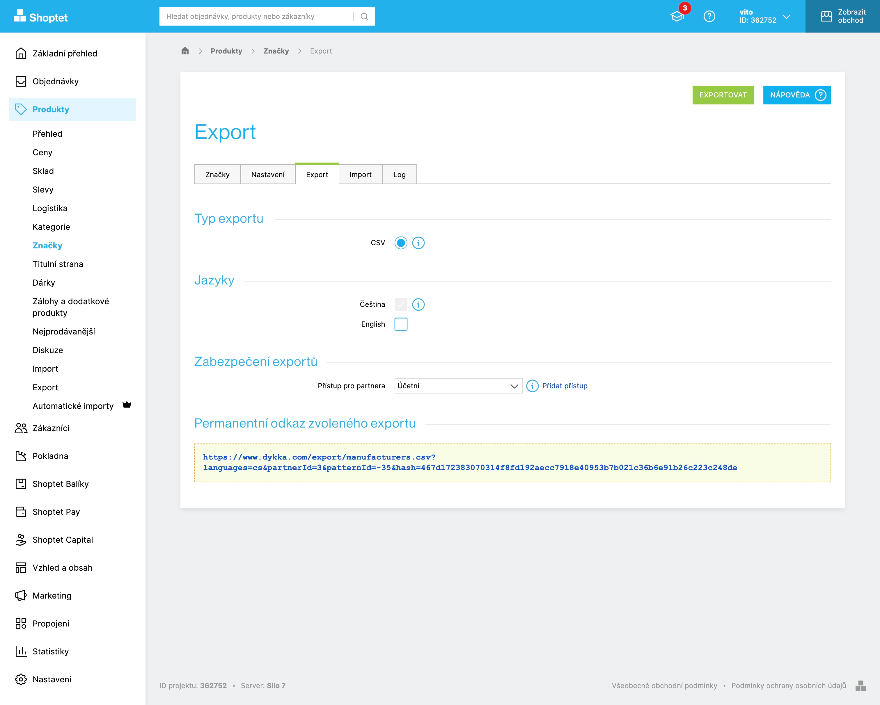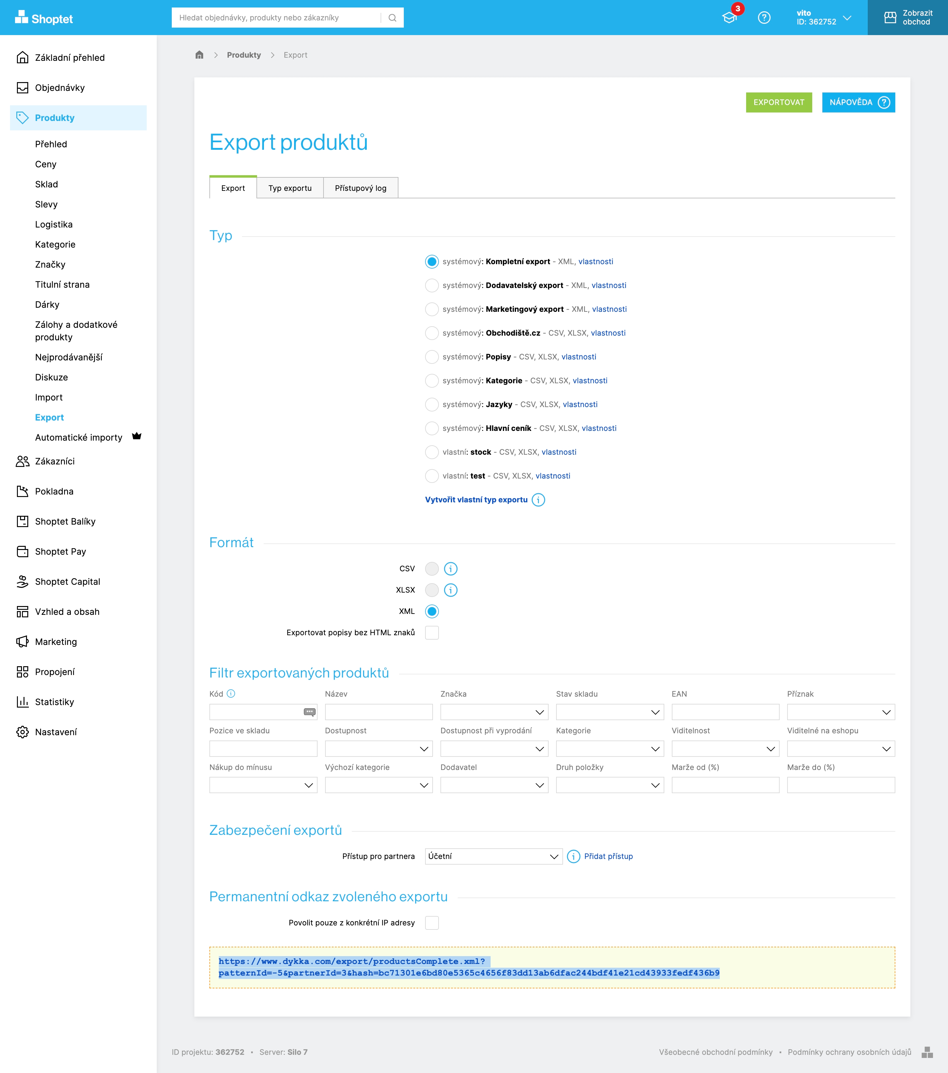 Shoptet allows exporting product data in XML format via a feed URL, while Shopify requires importing products from a CSV file in Shopify CSV format. To convert from Shoptet Complete XML to Shopify CSV, we used Mergado, which can transform and prepare data for import.