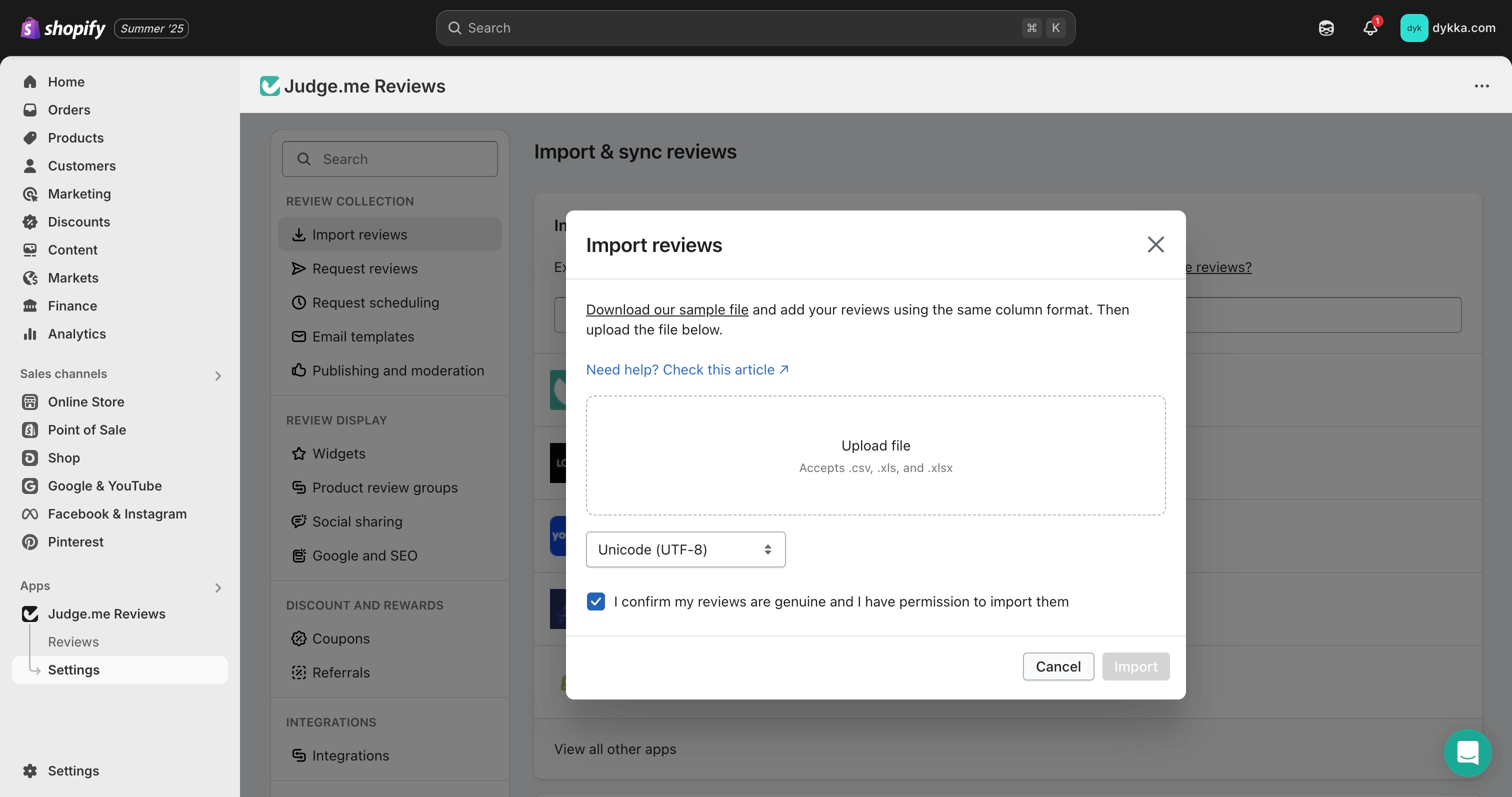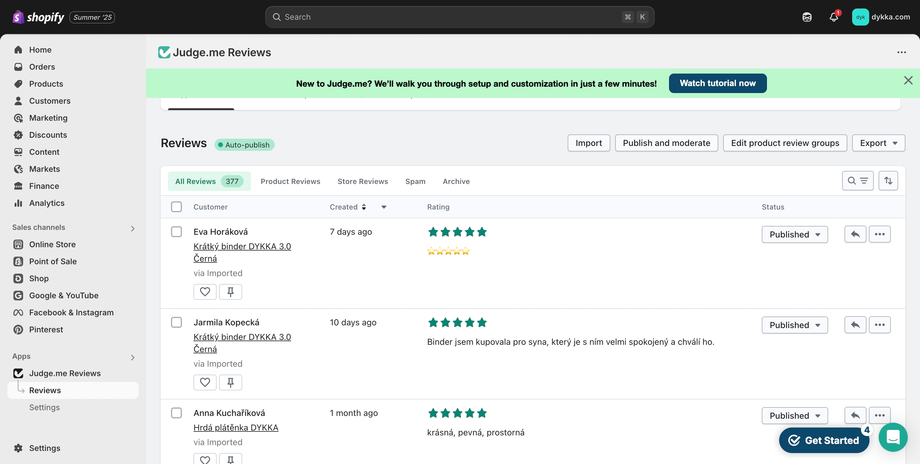- Shopify app: Judge.me – activated in the Apps section in Shopify admin