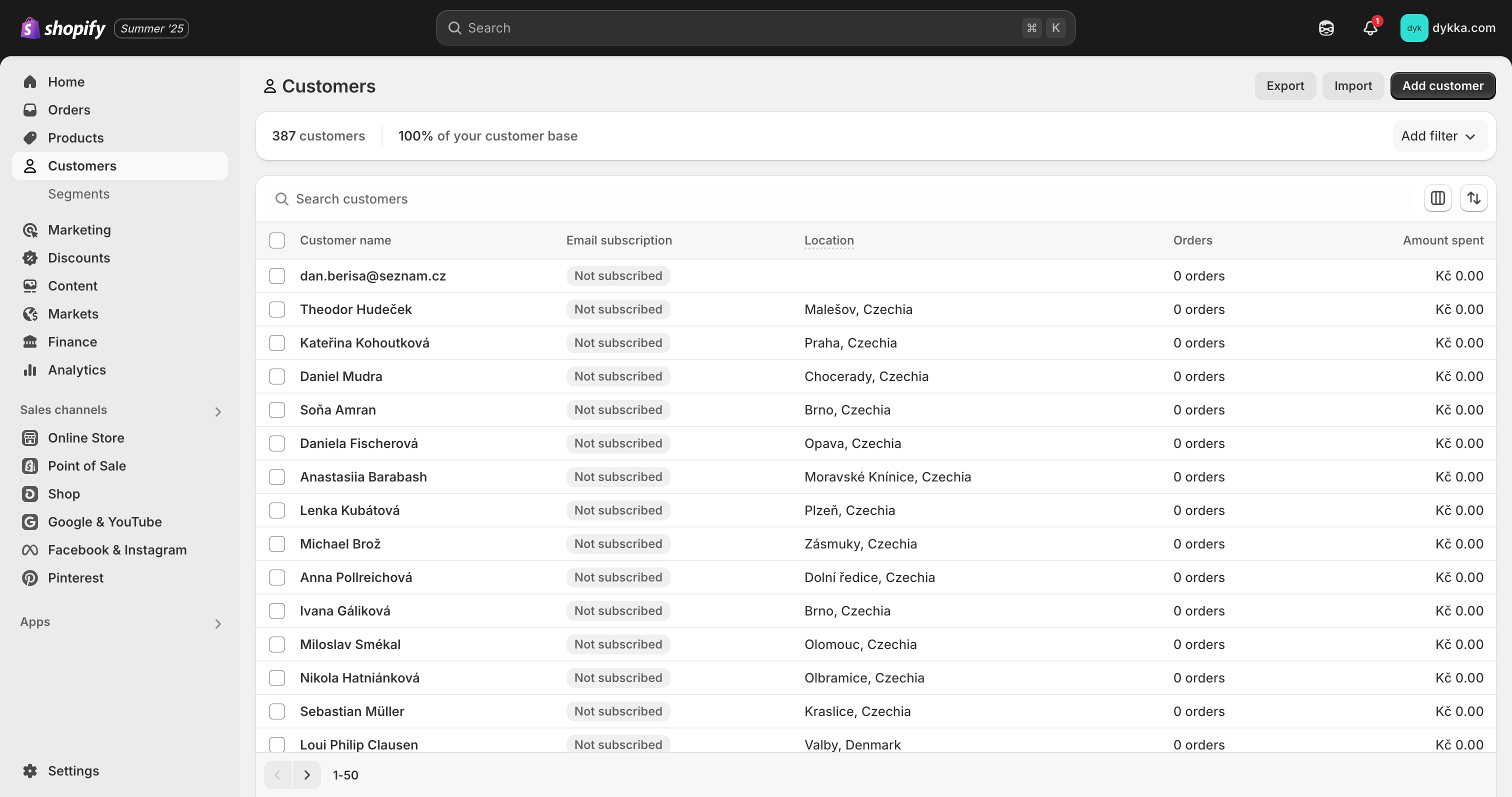 Shoptet allows exporting customers in CSV format. This CSV must be adjusted before importing into Shopify, and errors (e.g., country codes) must be corrected.