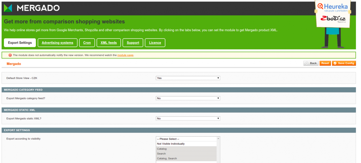- Go to Menu → Mergado →Mergado Marketing pack to set up language and currency preferences, export generation etc.
